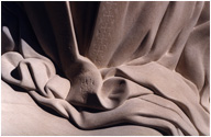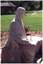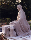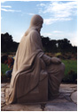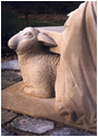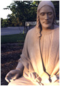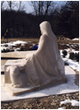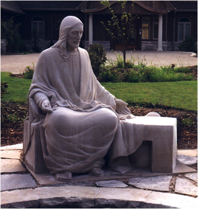 Carved from a single piece of Indiana Limestone (5 tons), the Christ figure is echoed in the symbolic carving of the lamb under the "back" of the bench, this being the main the view of the sculpture from the house, so connecting the viewer with the piece from either side. It is a deeply silent, contemplative piece, with symbolic references intertwined in the seemingly simple subject - for example, the tumbling folds of Christ's robe are reminiscent of a river flowing, meeting the pool of water at his feet, and symbolic decorative designs are etched into the borders of the cloak.