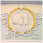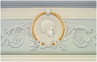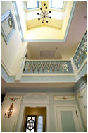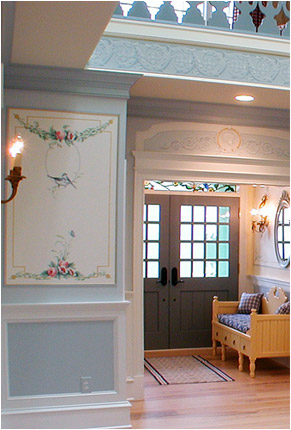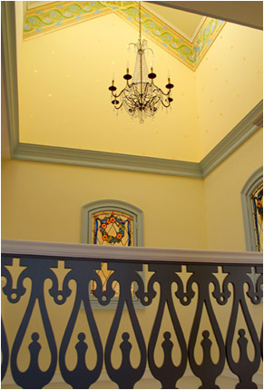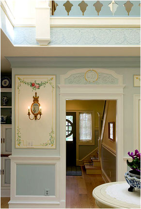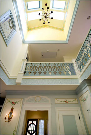 In the stairwell and around 2nd floor opening, below the balustrade, we created a formal Gustavian style border design, and, over each of the doors that open into the brahmasthan, we painted illusionist bas-relief 'cameos' of the clients' four children, set into trompe l'oeil decorative reliefs.