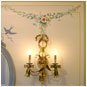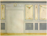 The panels were painted on canvas (a traditional wall decoration technique in Swedish houses, which tied in with our preference for painting murals on canvas in our studio) and then applied to walls and trimmed out on site with specially painted & gilded wood-frames for a true signature 'palace' look.