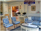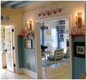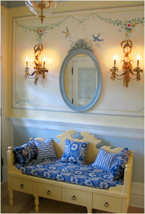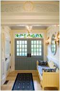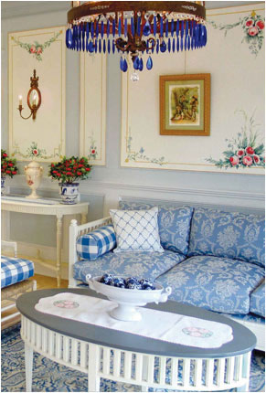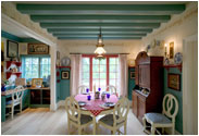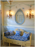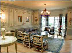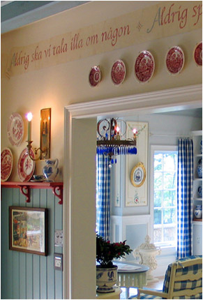 We worked with designer Everett Day to incorporate traditional, authentic Swedish flavors - blending elements from conventional Swedish country homes, the elegant Gustavian-style treatments from the great old manors of Sweden, and Carl Larsson's more rustic "craft/art nouveau" decorative concepts. We created designs for the sunny entryway, the formal living room, the brahmasthan (central atrium of the house), and the more "craft-style" dining room.